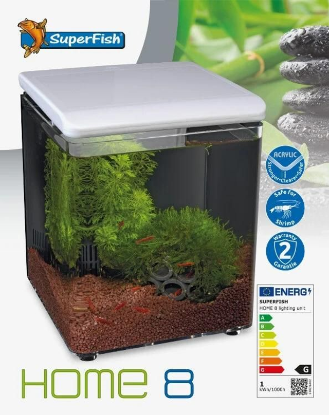 De SuperFish Home 8 is de blikvanger door zijn simplistische en strakke uitstraling het perfecte Superfish Aquarium voor in de Slaapkamer, Woonkamer, Keuken en Kantoor. Het Aquarium is echt plug-and-play, eenvoudig te installeren en te onderhouden. Het aquarium is voorzien met LED-verlichting en geïntegreerd binnenfilter met optionele ruimte om de verwarming in toe te voegen, als verwarming gewenst is adviseren wij de Eco Heater 50 watt van Superfish. De verlichting is te bedienen met de knop op de lichtkap, er kan zelfs een apart leverbare timer op aangesloten worden. Zonsopgangverlichting (wit en blauw) simuleert een natuurlijke zonsondergang, waarbij de lichtniveaus gedurende 30 seconden langzaam toenemen.
